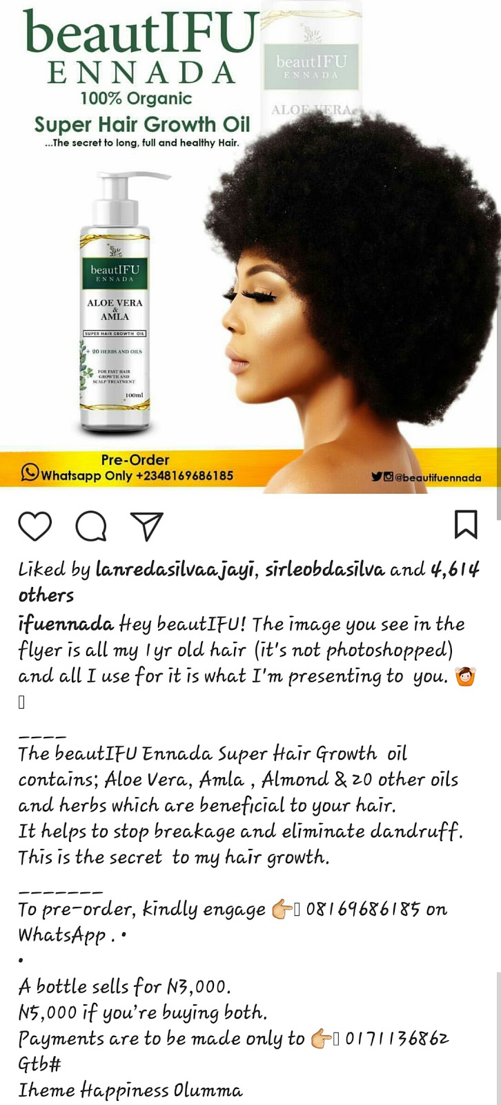 Ifu Ennada has taken to her Ig Page to announce the launch of her own brand of super hair growth oil, 'beautIFU', according to her, the oil is 100% organic.